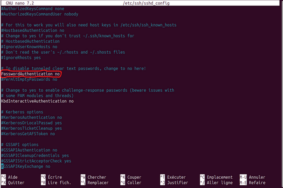 #PasswordAuthentication yes , nous la décommentons et remplaçons yes par no. Cela donnera donc