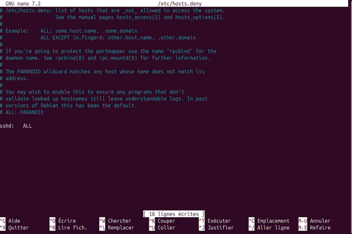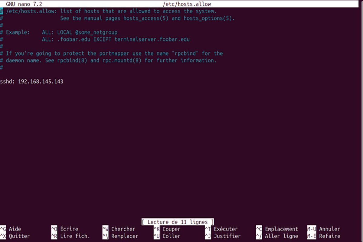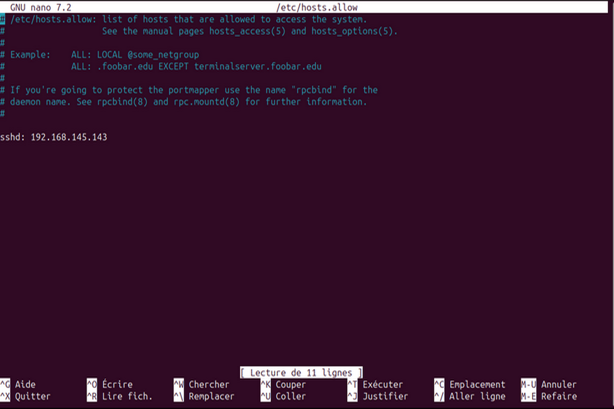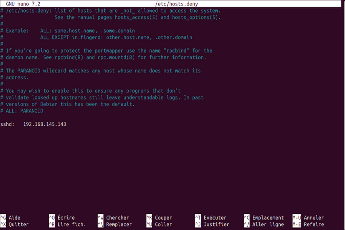 N.B : Il faut noter que les règles présentes dans /etc/hosts.allow prennent l’ascendant sur les règles présentes dans /etc/hosts.deny