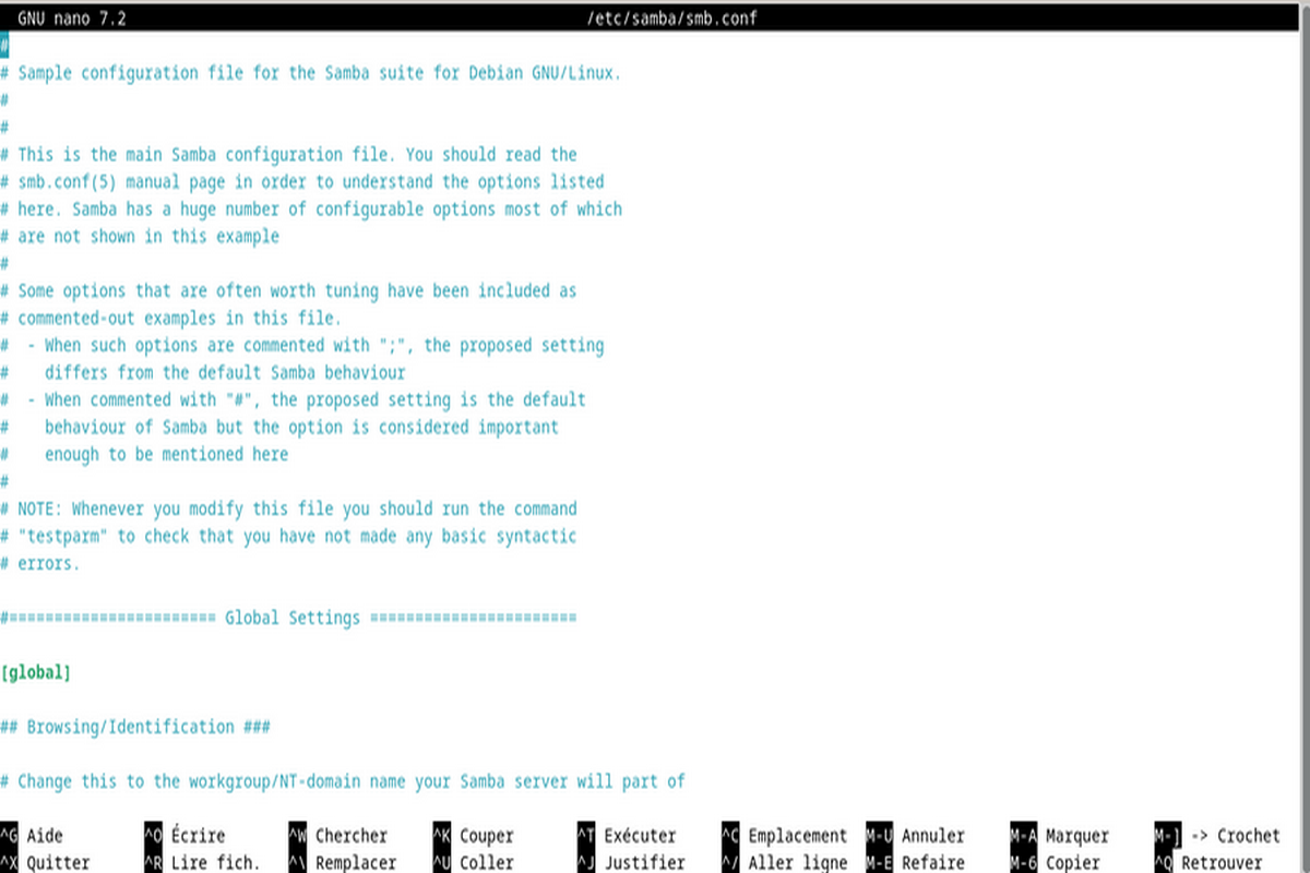 Les configurations que nous aurons à faire seront sur la partie serveur de Samba. La configuration côté serveur de Samba n’est basé que sur un seul fichier qui est /etc/samba/smb.conf. Il définit les paramètres de fonctionnement de notre serveur. Il se présente comme suit :